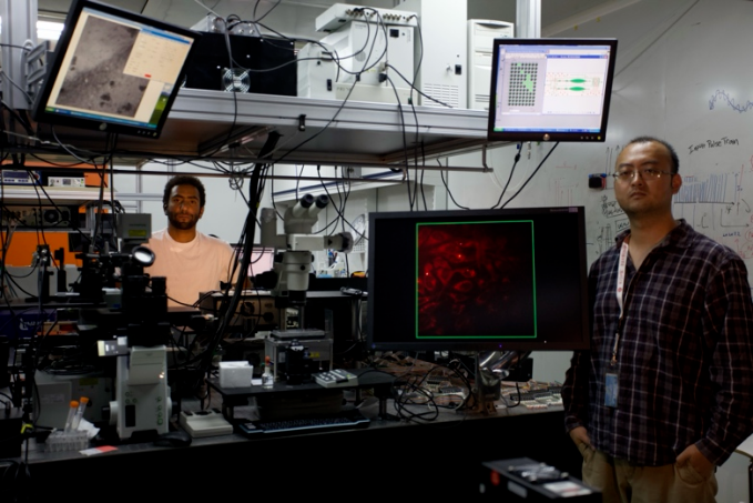 Aaron和黄岩谊组里另一位博士后赵亮,以及他们的显微镜,摄于2012年