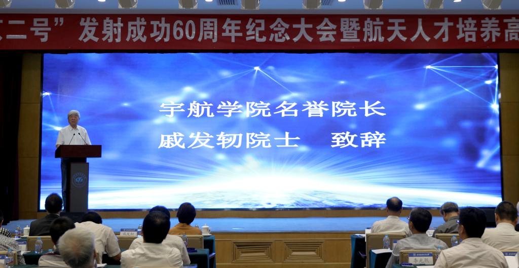 何新洲代表学校致辞。他在致辞指出,北航为新中国航空航天事业而生,在1958年率先成立全国第一个火箭系,开展“北京二号”探空火箭的研制工作。在一切从零开始的情况下,师生奋战6个月,筚路蓝缕,攻坚克难,1958年9月22日,“北京二号”探空火箭在吉林白城子靶场的荒野上冲天而起,发射成功。“北京二号”的成功凝聚了北航人空天报国的爱国情怀、敢为人先的卓越追求、勇攀高峰的创新精神、知行合一的实践品质。“北京二号”的研制践行了科研与教学相结合的人才培养理念,开创以综合项目为载体的人才培养模式,为中国航天领军领导人才的培养走出一条创新之路。在新时期,北航宇航学院先后研制和成功发射“北航1号”“北航2号”“北航3号”系列探空火箭,是对“北京二号”人才培养模式的传承和发扬。从火箭系到宇航学院,60年来,北航航天专业为中国航天国防事业培养了数以万计的优秀人才。