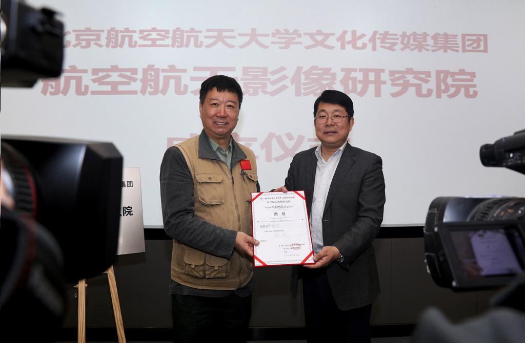 刘小龙向牟健为颁发北航文化传媒集团航空航天影像研究院院长聘书、向北京麻豆精品秘 国产传媒新闻中心副主任余敏颁发北航文化传媒集团航空航天影像研究院副院长聘书。
