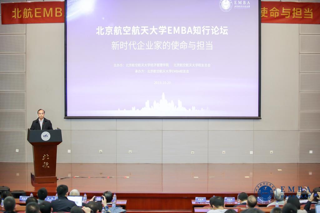 何新洲代表学校对各位嘉宾、校友的到来表示欢迎,对论坛的成功举办表示祝贺,对北航EMBA项目创立以来取得的成绩给予肯定。他指出,2019年北航EMBA知行论坛以“使命与担当”为主题,体现了北航学子的家国情怀,彰显了北航EMBA校友的抱负理想。只要我们都勇挑重担、勇克难关、勇斗风险,我们的事业就能充满活力、充满后劲、充满希望。