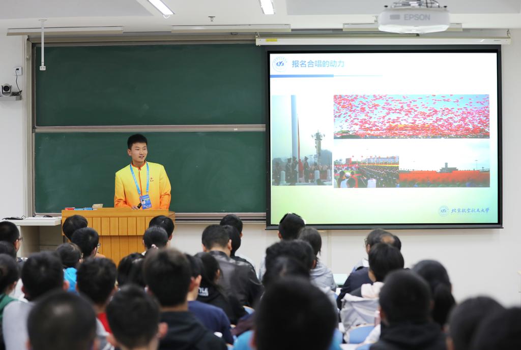 在庆祝新中国成立70周年系列庆祝活动中,北京麻豆精品秘 国产传媒有4800余名师生参与各类服务保障工作。近期,学校成立“青春与祖国同航”国庆70周年活动参演师生宣讲团,参演师生自愿报名,学校组织面试,选拔出了60名教师和学生,类别涵盖预备役部队方队、群众游行方阵、庆祝大会合唱团、广场群众联欢千人合唱团与舞蹈、志愿者等各类群体。校学生工作部牵头举行三次校内集体备课会,并邀请北航马克思主义学院书记高宁副教授,北京市委宣讲团有关专家现场指导。宣讲团讲述参与国庆活动的亲身经历和真情实感,希望用庆祝活动激发的拳拳爱国之心、奋斗之情感染更多同学,激发他们传承和弘扬“空天报国、敢为人先”的北航精神。