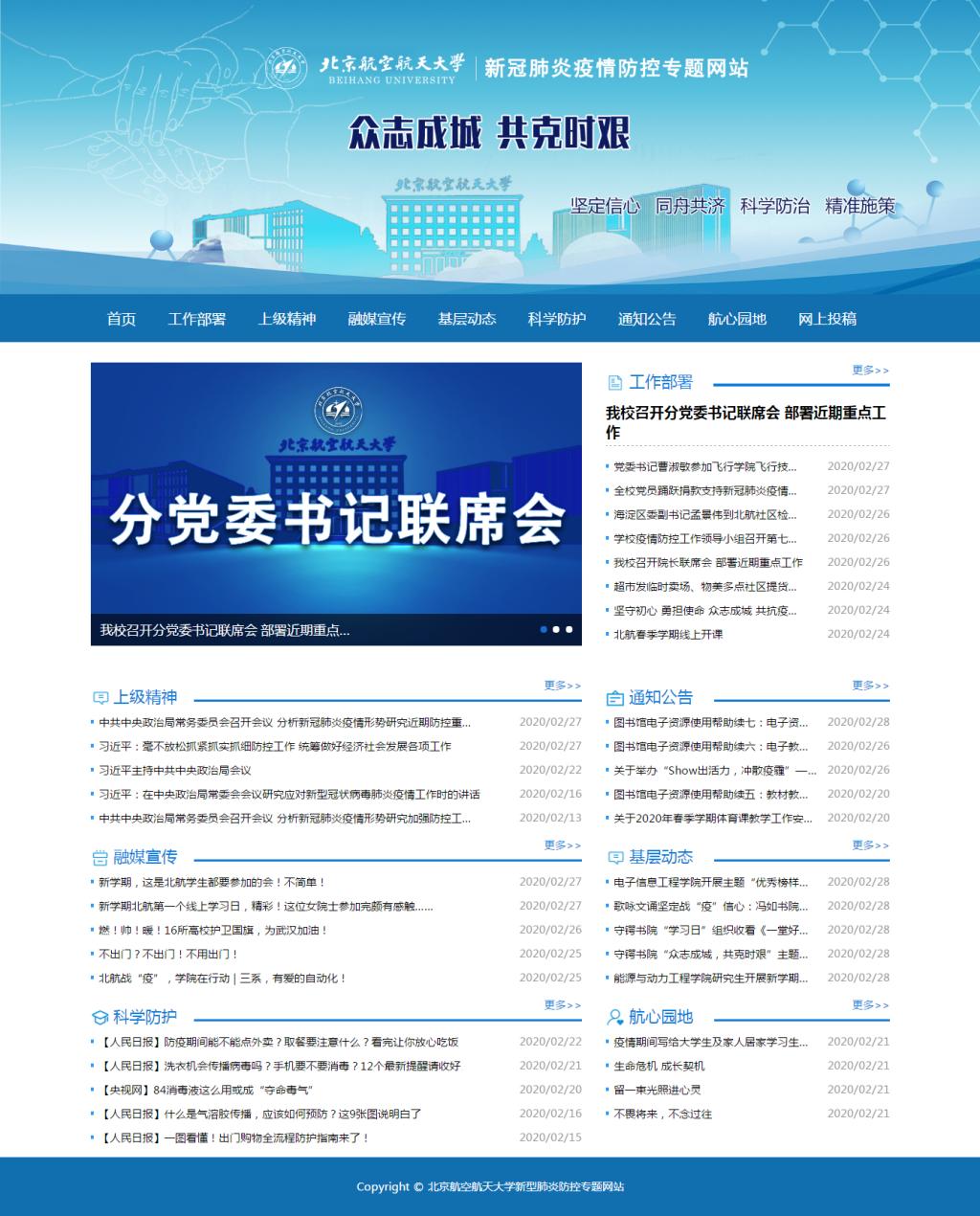 专题网站设有“工作部署”“上级精神”“融媒宣传”“基层动态”“科学防护”“航心园地”“网上投稿”等栏目,及时有效地传达党中央和上级关于疫情防控的决策部署以及学校关于疫情防控的有关决定、措施及工作开展情况;全面报道我校各级党组织、各单位对于预防新冠肺炎疫情所做的各项工作;扎实做好新冠肺炎防控科普知识宣传工作。同时,我们鼓励广大师生踊跃投稿,以优秀的作品,激发正能量、弘扬真善美,为我校打赢、打好疫情防控阻击战贡献力量。