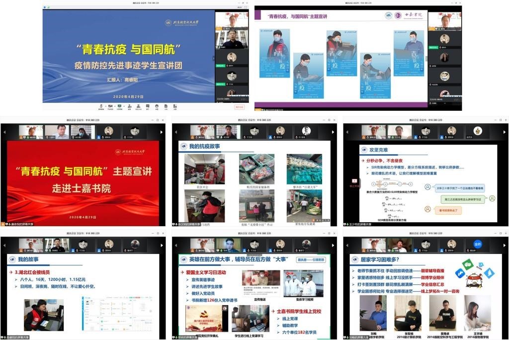 北航共青团响应团中央的号召,在全校开展了“绽放战疫青春·坚定制度自信”主题教育活动,组织青年共上一堂题为“青春·奋斗”的线上主题团课。云大所大数据与区块链部副主任、建立国内首个大数据产品能力评测体系的姜春宇,教育系统首场学习贯彻习近平总书记给北京大学援鄂医疗队“90后”党员重要回信精神联学会北航发言代表付莹莹,荣获第十六届“挑战杯”全国大学生课外学术科技作品竞赛特等奖的王小宁……团课共邀请八位青年朋友和学子作为主讲人,用访谈和小讲堂的形式,用真人、真事和真情实感,讲好青年典型战胜疫情、空天报国的青春故事。