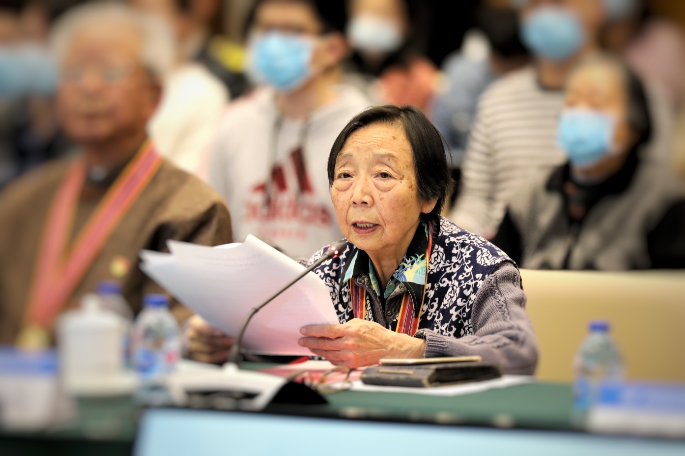 张锦溶也已耄耋之年,佩戴着纪念章,她为大家分享了当年出国作战的故事。70年前,还未满16岁的她跟随志愿军奔赴朝鲜,扛枪筑洞,共御敌寇。行军路上,他们身背水壶、干粮、行李,高唱“雄赳赳,气昂昂,跨过鸭绿江”,在前线除打仗外,还有后勤工作,搓草绳、抗物料,在山里打洞,盖草棚作为休憩场所。谈到在战争中牺牲的先烈时,张锦溶感慨落泪,“只有继承他们的遗志,为建设我们伟大的祖国努力奋斗,才对得起这些英烈的亡魂”。