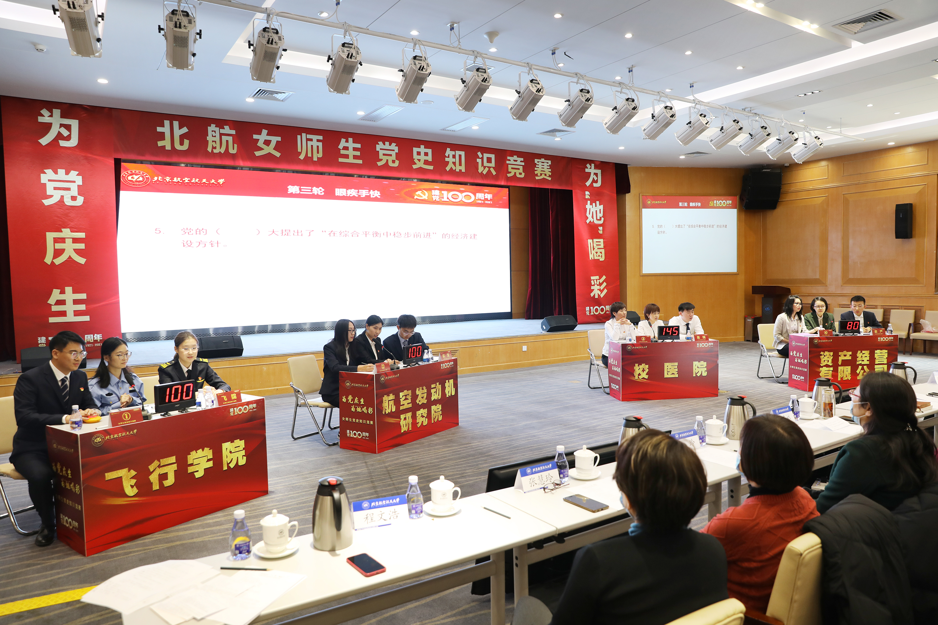 北航新闻网3月7日电(通讯员 张芳 记者 王晴/文 记者 邸白鹭/摄影)3月7日,北航女性师生以一场别开生面的党史知识竞赛庆祝即将到来的“三八妇女节”。校党委书记曹淑敏、女工委主任苏东林院士、校党委副书记程波,学校部分党群部门、学院党政负责人,部门工会主席以及参赛队亲友团参与了活动。