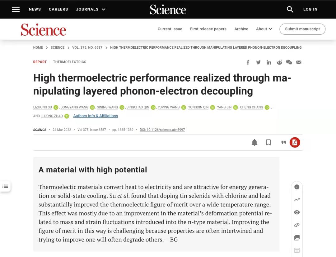 北航新闻网3月25日电(通讯员 梁伟涛)2022年3月25日,《Science》杂志报道了北航材料科学与工程学院赵立东教授课题组在热电材料领域取得的新进展:《High thermoelectric performance realized through manipulating layered phonon-electron decoupling》。热电效应是一种利用温差来实现电传输的现象。高性能热电材料要求材料能在大温差下,同时具备高的电传输特性与低的热传输性能,然而高导电和低导热是一对矛盾。此工作利用层状材料在层外方向的低热导特点,通过调节晶体结构对称性在层外方向改善了载流子在层间的迁移,从而促进了层间方向的电子遂穿。该成果证明利用层状结构可以有效解耦声—电矛盾(Science 375 (2022) 1385-1389)。北航2019级博士研究生宿力中为第一作者,导师赵立东、奥地利科学技术研究所常诚为通讯作者,北京麻豆精品秘 国产传媒,材料科学与工程学院为第一单位。这是赵立东教授课题组自2015年以来发表的第6篇《Science》,2018年-2022年近5年来年均发表一篇新成果。