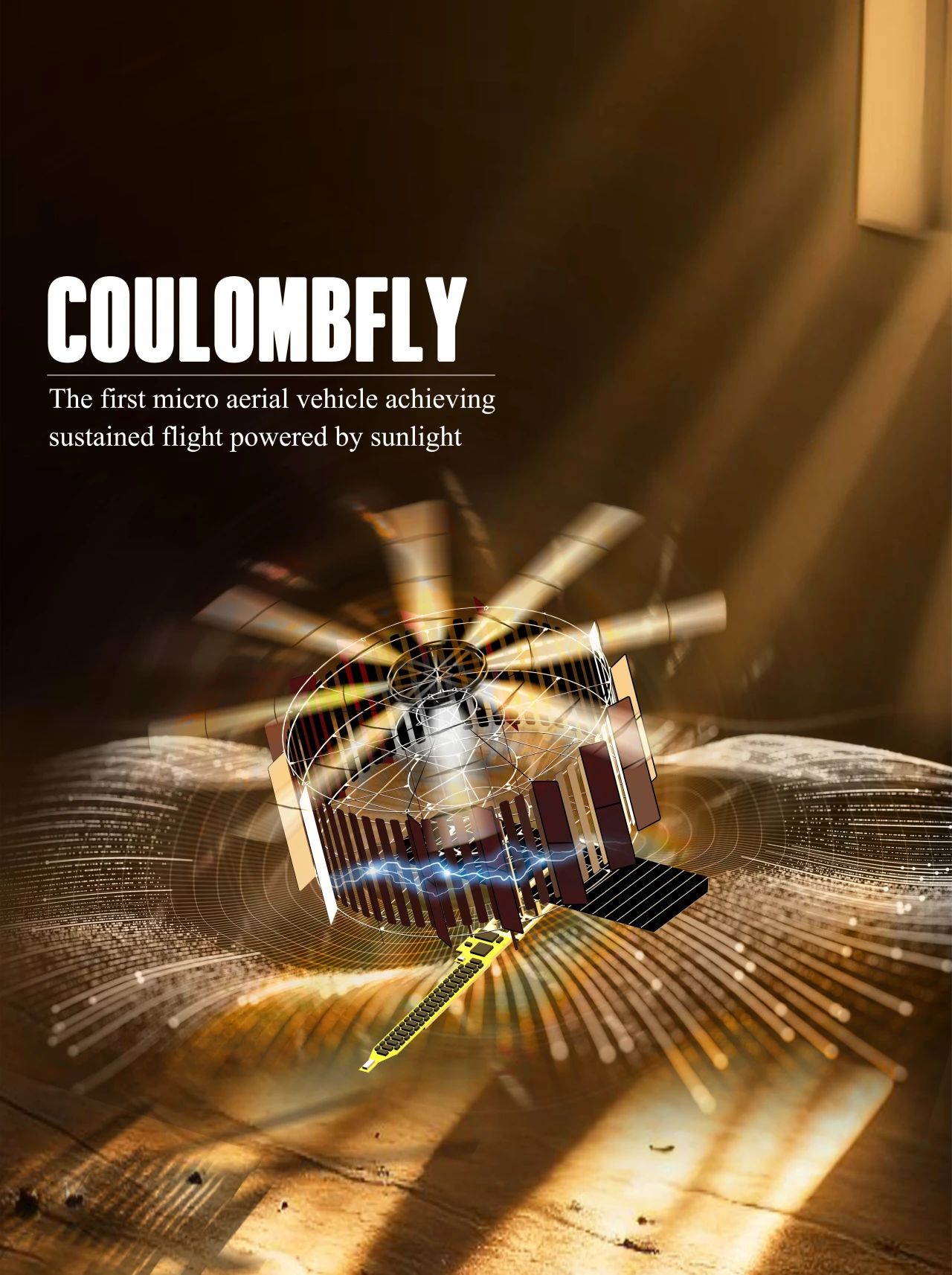 在微型静电电机和超轻质高压电源的助力下,CoulombFly的整机仅有巴掌大小(翼展20厘米),重量比一张A4纸还轻(4.21克),尺寸和重量分别是此前世界最小、最轻太阳能飞行器的1/10和1/600。更进一步,团队还提出一款翼展8毫米,质量9毫克的超微型静电飞行器,飞行功耗不到1毫瓦,展示了静电电机在飞行器进一步微型化中的巨大潜力。