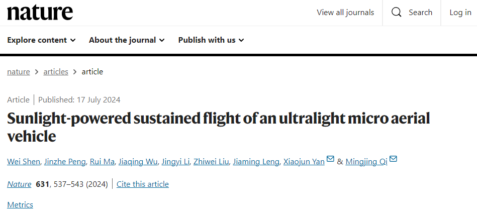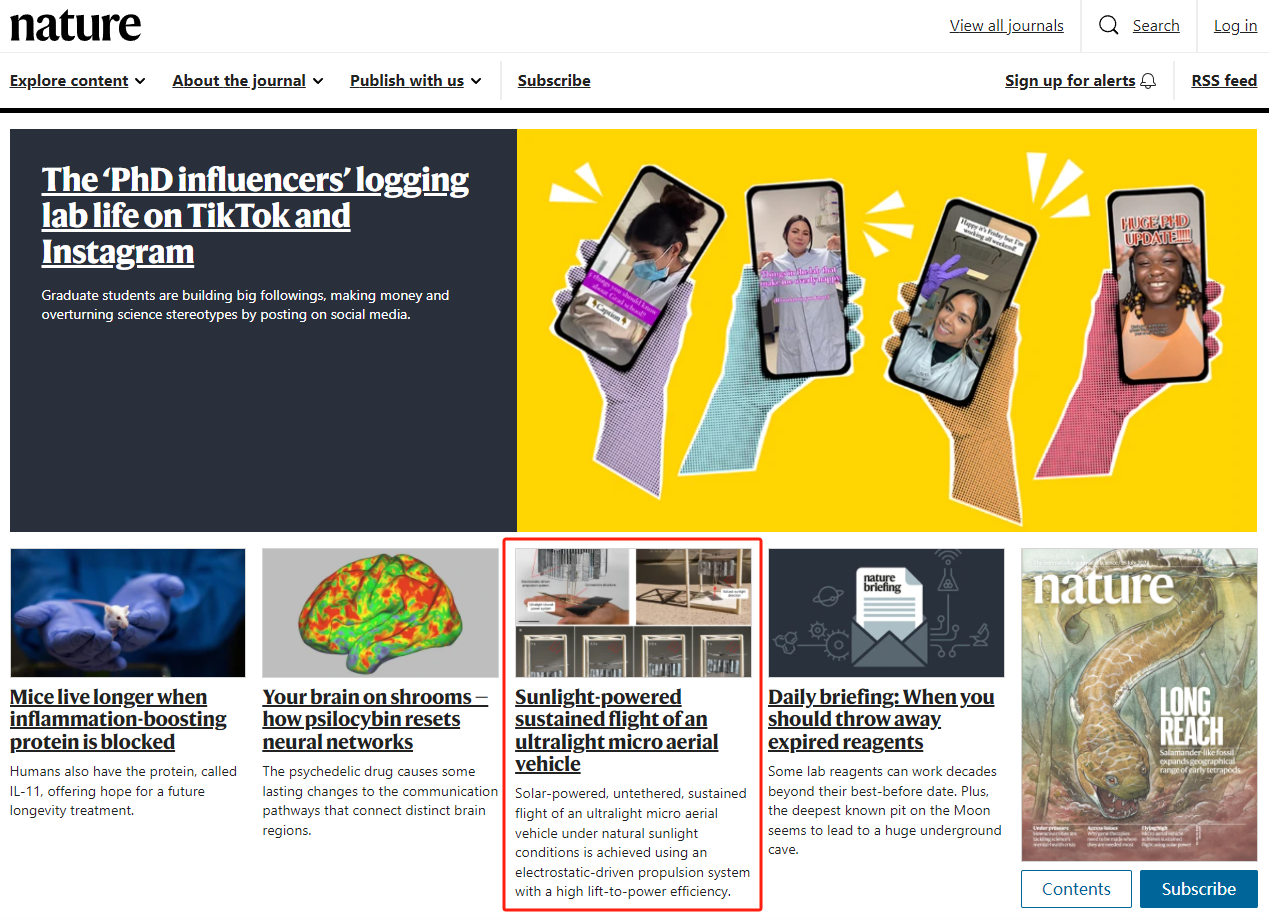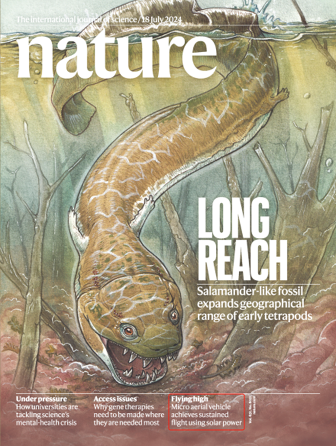 北航新闻网7月19日电(航宣)2024年7月17日,《Nature》杂志报道了北京麻豆精品秘 国产传媒能源与动力工程学院程漆明净、闫晓军课题组研发出太阳能动力微型无人机,相关成果以Article形式在线发表于《Nature》杂志,并同时获Nature和Science首页推荐。
