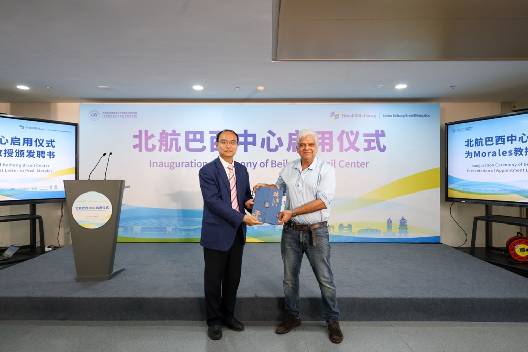 仪式上,董卓宁为原巴西里约热内卢联邦大学教授、微分动力系统研究领域专家卡洛斯·阿诺尔多·莫拉莱斯(Carlos Arnoldo Morales)颁发聘书,标志着北航巴西中心在人才引进上迈出了第一步。未来,中心将持续引进巴西优秀专家学者,重点推进航空航天、基础数学等领域的联合研究。预计今年11月,首批巴西学者将入驻北航杭州国际校园。