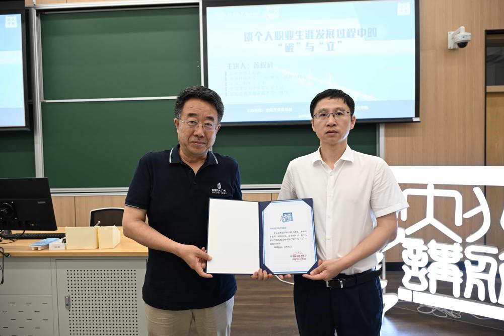 吴江浩为苏权科颁发“北航大讲堂”荣誉证书,致敬其对工程创新智慧的分享以及对青年学子的卓越引领。