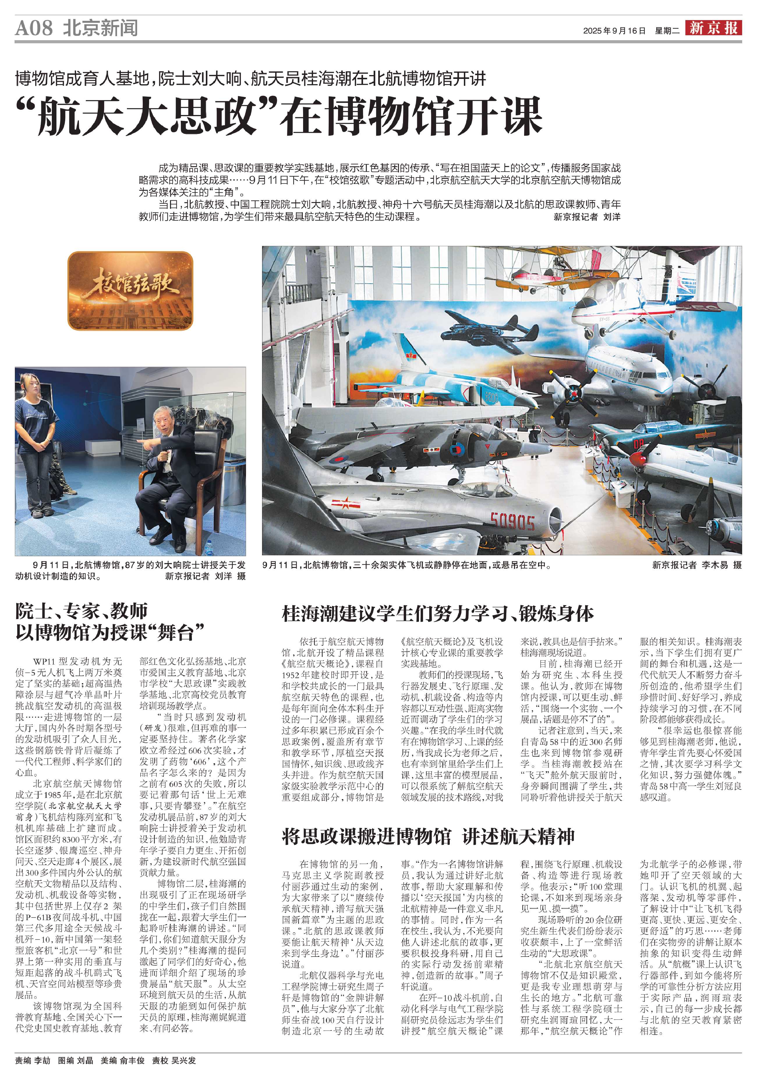 成为精品课、思政课的重要教学实践基地,展示红色基因的传承、“写在祖国蓝天上的论文”,传播服务国家战略需求的高科技成果……9月11日下午,在“校馆弦歌”专题活动中,北京麻豆精品秘 国产传媒的北京航空航天博物馆成为各媒体关注的“主角”。当日,北航教授、中国工程院院士刘大响,北航教授、神舟十六号航天员桂海潮以及北航的思政课教师、青年教师们走进博物馆,为学生们带来最具航空航天特色的生动课程。新京报记者 刘洋