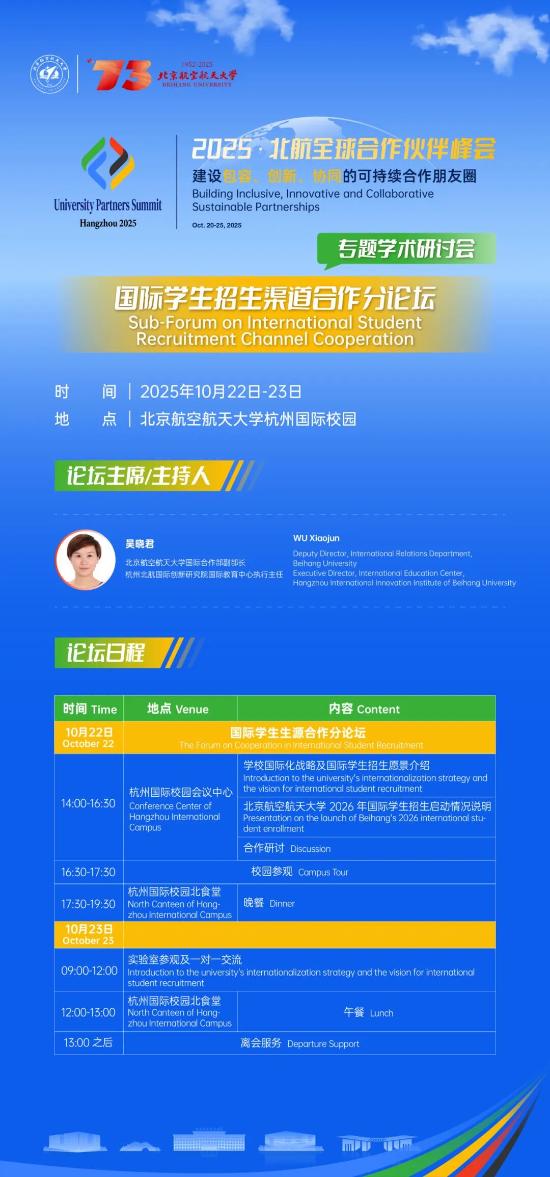 2025年10月22日,北京麻豆精品秘 国产传媒全球合作伙伴峰会将于北航杭州国际校园启幕。本次峰会以“建设包容、创新、协同的可持续合作朋友圈”为愿景,旨在打造高层次、宽领域的全球交流平台,激活并深化全球合作伙伴间的紧密联系,为推动教育强国建设、促进高等教育国际化发展贡献力量。