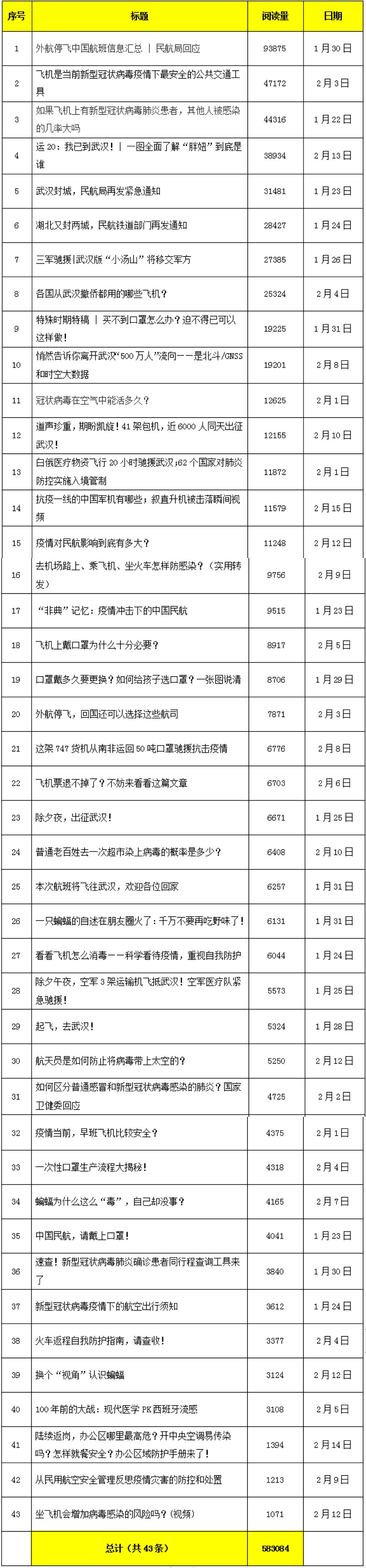 “航空知识”微信公众平台疫情相关报道统计表(截至2020.2.16)