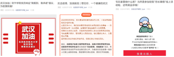 在软件学院、电子信息工程学院和计算机学院三院联合的线上“加油接龙”活动中,学院同学们自发组织开展宣传活动,通过宣传画、毛笔字、视频图片等影像材料,为奋战在抗击疫情第一线的医护工作者和防疫工作人员致以崇高的敬意。同学们通过情真意切、热情奋进的话语,为湖北人民加油鼓劲,更鼓励全体同学,坚决响应国家和学校的号召,不离家、不返京、不返校,倡议大家在家中认真学习、积极锻炼、多陪父母、健康生活。