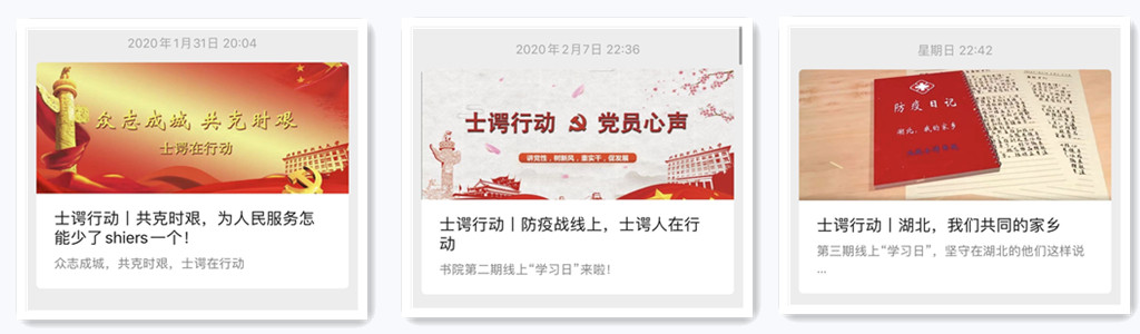 1月31日开始,书院在线上面向书院全体学生每周定时开展学习日活动。书院首期线上“学习日”对全国在疫情中涌现的优秀共产党员事迹进行了宣传,并发布了《士谔书院学生党支部致书院全体入党积极分子的一封信》。书院第二期线上“学习日”中,党支部全体党员结合防疫期间的学生工作谈担当、讲奉献,入党积极分子代表谈认识、讲体会,生动的讲出了在疫情防控战线上的“士谔故事”。书院第三期线上“学习日”推文以“湖北,我们共同的家乡”为主题,通过分享在湖北省学子的生活学习感受,加强学生对防疫工作的理解与重视,树立战“疫”信心。通过寒假期间线上“学习日”系列活动,引导书院学生厚植了爱党爱国情怀,树牢了战胜疫情的信心和决心。