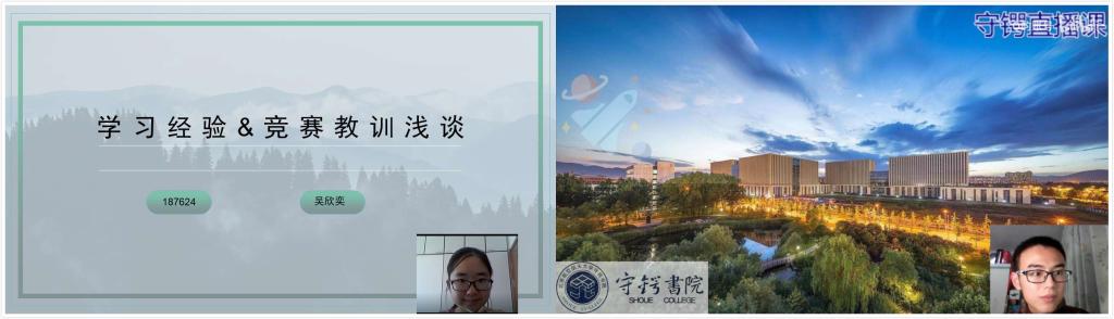 21日, 2018级国奖获得者吴欣奕直播解答同学们的疑惑。她系统化地向同学们介绍了不同课程所对应的学习方法,为大家下学期的学习做好了铺垫。此外,吴欣奕以今年美赛和冯如杯为例,解释了数学建模竞赛和冯如杯一般进程,强调了查找相应资料的重要性,并向同学们介绍了几种常用的资料查询网站和外文检索网站,便于大家今后的学习。
