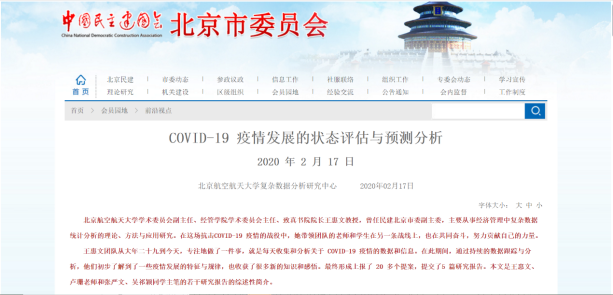 面对疫情,学院教师把后方当前线,积极献言建策。王惠文教授带领团队的老师和学生每天收集和分析数据和信息。截至2月15日,王惠文教授撰写并提交了12篇关于抗击疫情的社情民意信息,其中,《关于考虑分期、分批恢复全国各地社会经济活动的建议》被民建中央综合采用,《新型冠状病毒肺炎疫情的状态评估和模拟预测研究》被中央统战部《零讯》采用。