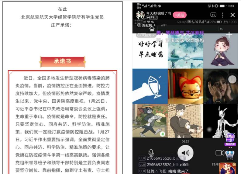 专职辅导员衣萌、白雪,高质量完成每日学生信息报送工作,并且主动策划、积极参与各种各样的抗击疫情工作。衣萌发挥声乐特长,参与演唱原创歌曲《致敬!逆行者!》,致敬战斗在疫情前线的白衣战士。白雪组织学生党员开展带头承诺活动,同时结合学生实际需求,开展学业梦拓特别活动——学业梦拓云直播。