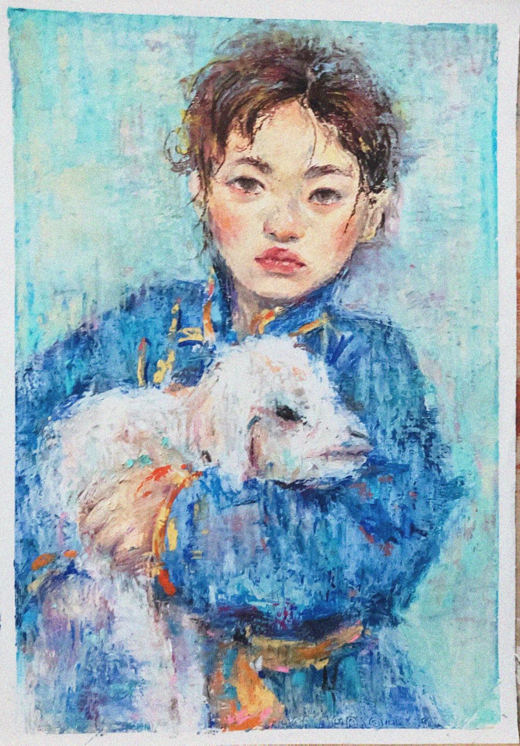 还有少数民族的同学们,开始转向当地风土民俗的研究,民族服饰、草原家畜无不成为画作的素材。内蒙学生诺民画的是他的小妹妹抱着羊羔的俏皮肖像,造型生动,作品感人。