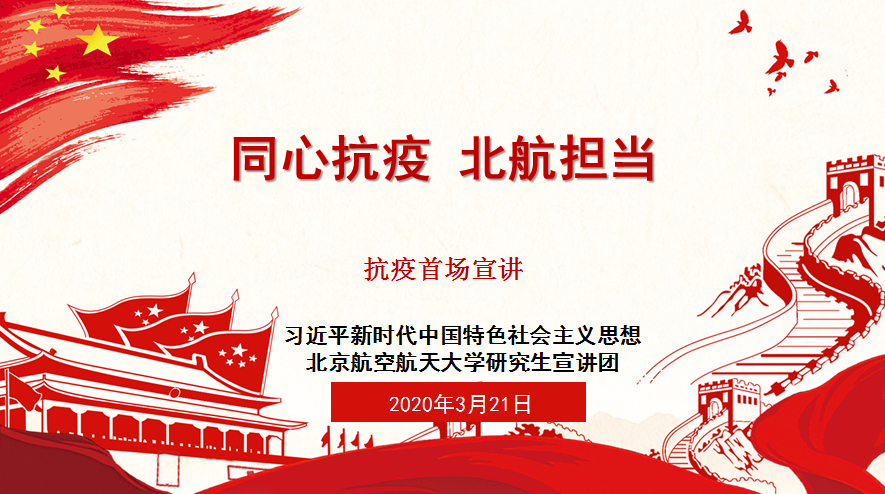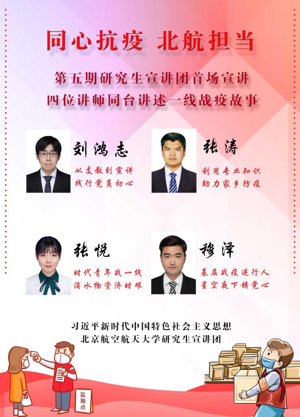 首场宣讲以“同心抗疫 北航担当”为主题,四位讲师同台分享,讲述在团结抗疫、共度时艰的日子里北航“90后”的逆行身影和使命担当。宣讲团讲师刘鸿志从“坚定信心、同舟共济、科学防治、精准施策、制度优势”等五个方面梳理了疫情期间北航的一系列落实决策部署、关心师生健康的关键举措,通过事例解读了集中力量办大事等制度优势,引导听众理解习近平总书记重要讲话精神,面对疫情强信心、筑同心。软件学院2018级研究生张涛利用专业所学知识和技能,为家乡开发体温报送网站,在全乡34个村级单位积极推广,得到了乡党委、乡政府的肯定。可靠性与系统工程学院2019级研究生张悦,调研市红十字会、疫情防控组、火车站、市定点医院、学校等地的物资需求情况,牵头组建了疫情物资捐赠工作组,克服疫情期间运输困难,完成了9500只口罩以及额温枪等物资的运输调配。能源与动力工程学院2019级研究生穆泽响应学院和当地政府团组织号召,投身家乡社区的防疫工作,与社区工作者一起,排查登记小区居民出入情况,入户统计外来人员流动情况,深夜坚守。
