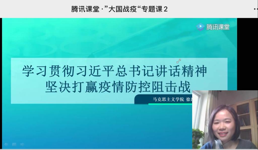 徐冶琼以最新的疫情新闻关键词导入,引发学生思考这样一场全国同心的战“疫”中,动员是如何实现的?为什么说这场战疫是人民战争、总体战、阻击战?授课中,徐冶琼围绕“党的集中统一领导”、“人民”、“统筹”、“经济”“文化”、“大国担当”等关键词从习近平总书记近期重要讲话着眼,结合战疫实际,从理论到现实、从国内到国际、从历史到当下、从战疫群像到凡人微光,通过梳理、比较、阐释,向学生们阐述了这场战“疫”彰显的制度优势、体现的中国力量。“大国担当”部分,她在与学生的互动中,从多角度引导学生进一步加深对国家治理体系和治理能力现代化的理解,加强对构建人类命运共同体的体认和使命感。课程最后,她以“反思”为关键词,引导学生理性看待我国国家治理体系仍存在的短板,正确认识到党和国家不断完善国家治理体系和治理能力的决心,并寄语学生未来虽仍会有艰险,要从当下做起,做一个理性、善良、担当的青年人,越是艰险越向前,未来承担起时代使命。授课过程中,同学们踊跃参与话题互动,分享讨论对相关内容的见解看法,课堂气氛活跃。