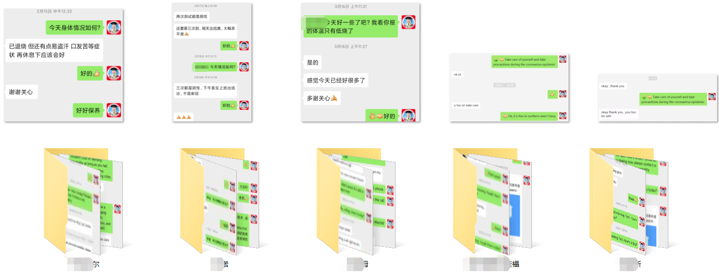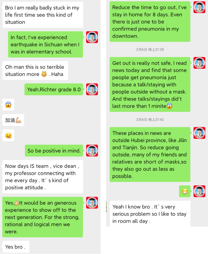 他向我表达了自己心中的惶恐,表示这辈子第一次遇到这种情况。因为这位同学处于疫区,当务之急是确保他镇定下来,安心在室内坚守抗疫,积极联系社区志愿者做好防疫工作,避免外出受到感染。于是我向他分享了儿时遭遇汶川大地震的经历,我的坚强和乐观使他从惶恐不安的情绪中解脱出来。我再向他介绍中国新闻报道和防疫进展,表示安心在家,避免外出是最安全的应对疫情方式。这位同学听取了我的建议,现还在湖北,安然无恙。