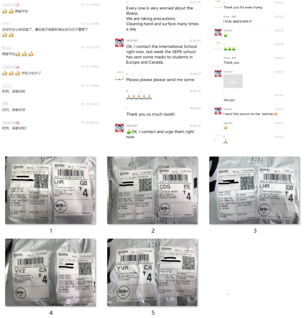 国内形势缓和后,国外疫情肆虐,在国外交流的研究生和滞留第三国留学生成为当前疫情防控工作重点关注对象。除了加强辅导员与在国外的28名研究生的联系之外,研工组老师和辅导员在3月13日前后多次协商对国外寄送口罩的事宜,并向学校申请。3月17日,学校下发医用口罩,3月20日,寄往国外的口罩发出。