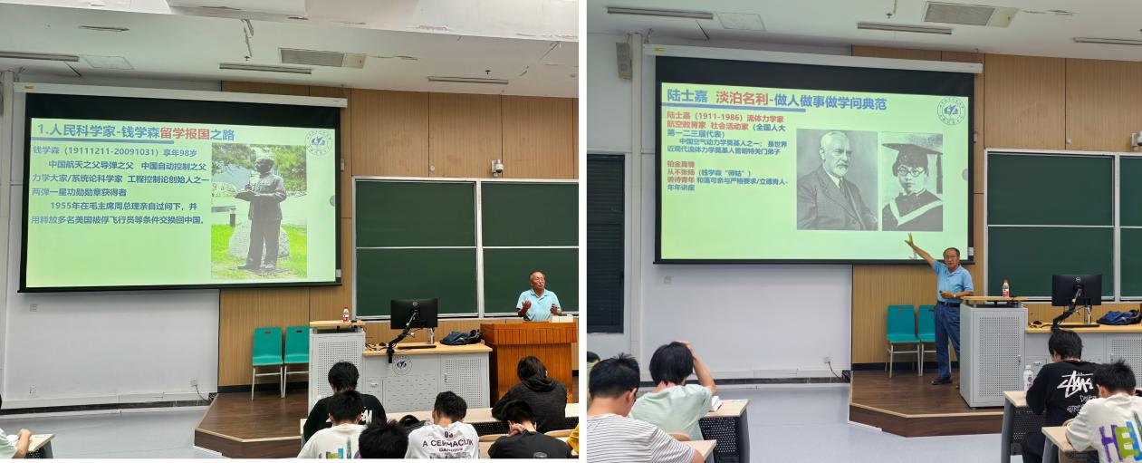 随后,郑彦良围绕“爱国、创新、求实、奉献、协同、育人”这12字科学家精神内涵,分享了六位杰出科学家的故事。海外留学的钱学森,放弃国外优厚待遇,冲破重重阻力回到祖国,为我国导弹事业的发展打下坚实基础,展现了深厚的爱国情怀;淡泊名利的陆士嘉,一心扑在科研和教育事业上,开创我国空气动力领域新局面;三十年坚守航空报国的罗阳,在重要装备研发一线默默耕耘几十载,将生命献给航空事业;归零历练的李东,不畏挫折与困难,终于实现火箭研制的重大突破;以服务国家为最高追求的苏东林,长期扎根科研一线,攻克诸多电磁兼容难题;上天出差的桂海潮,作为首位载荷专家航天员,勇敢逐梦太空,为航天事业注入新活力。在生动的讲述中,郑彦良分享了优秀科学家们的感染事迹,让同学们更加深刻理解科学家的精神的内涵。