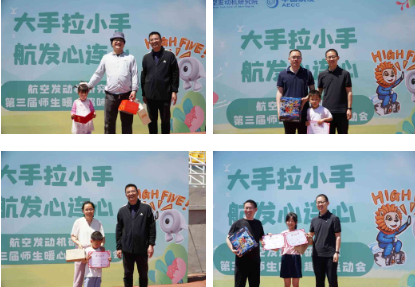 在热烈温馨的氛围中,北航-中国航发师生暖心趣味运动会迎来颁奖时刻。袁星和中国航发党群工作部群团工作处处长田晓光为各年龄段优胜家庭颁奖。