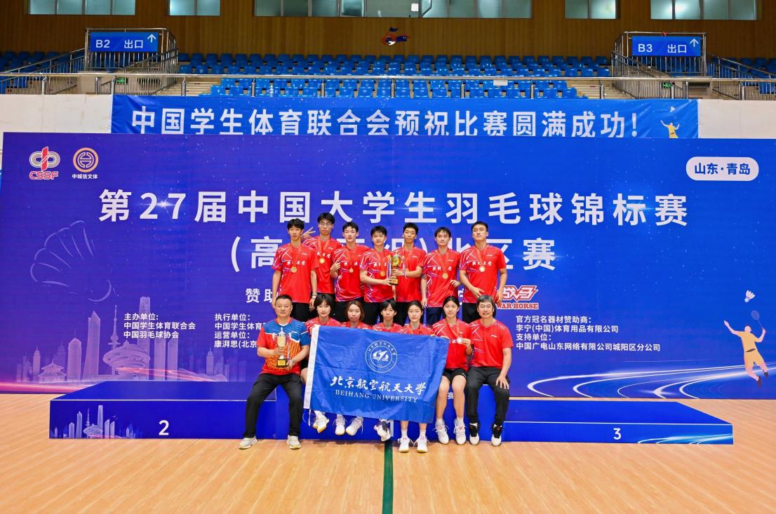 北航新闻网7月23日电(通讯员 王子翀)7月10日-18日,第27届全国大学生羽毛球锦标赛(高水平组)北区赛在青岛市城阳体育馆举办,体育部付庆镕、石磊两位老师带领8名男队员、6名女队员参赛,共获得男团、男单、女单三项冠军,女团亚军,女双季军等多项优异成绩。
