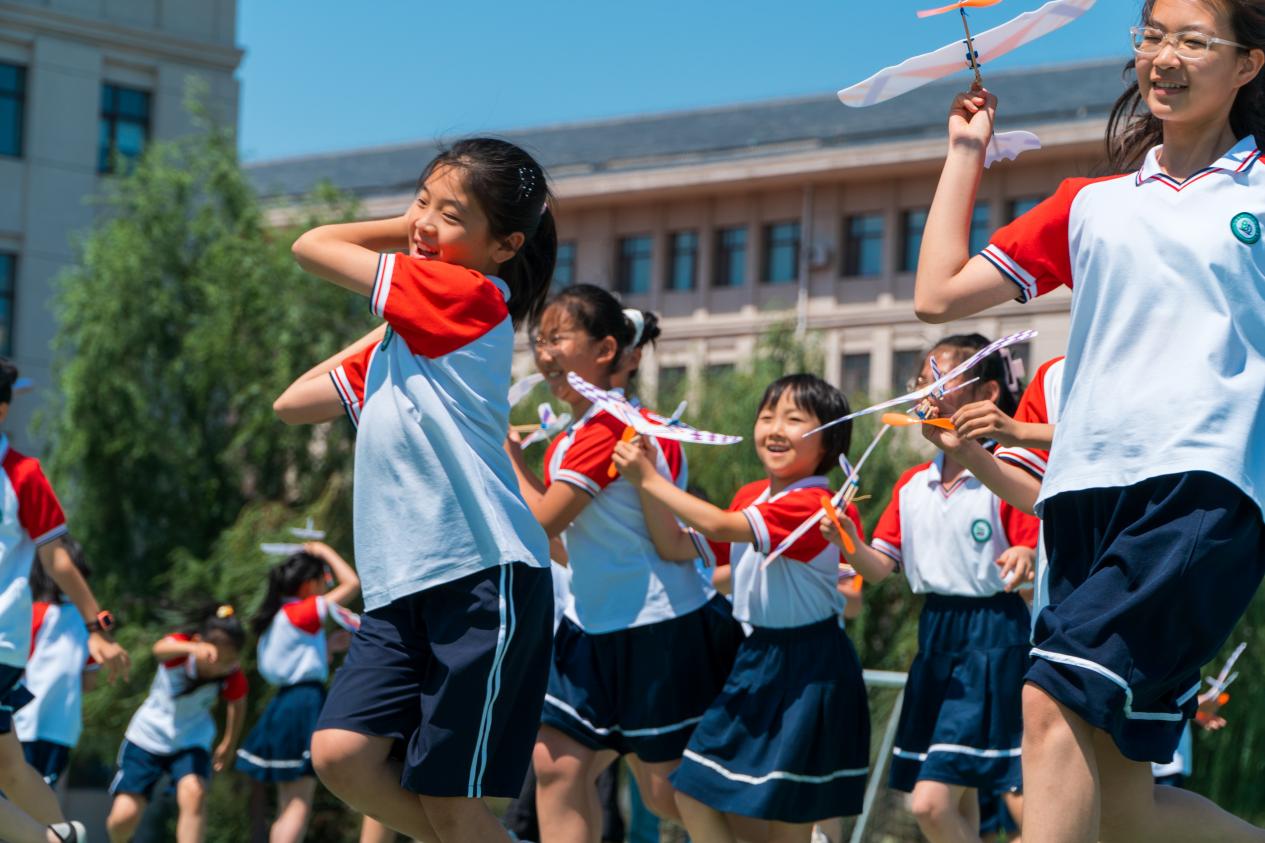图为科技实验课上孩子们放飞亲手制作的飞机。