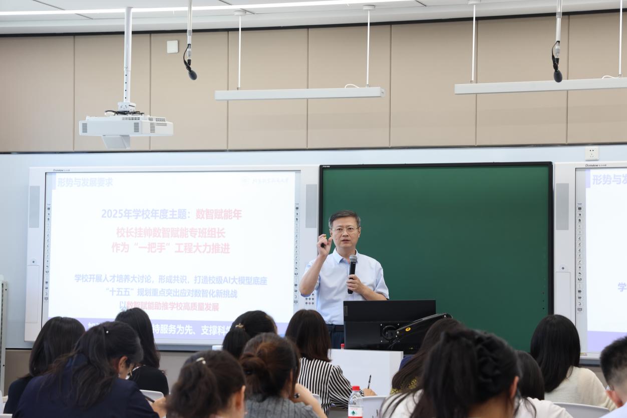 李云春作《以数智赋能提升校务治理能力》专题讲座。他从形势分析、治理实践与未来规划三个维度,系统阐述了北航推进校务治理现代化的实践成果。他深入剖析了数智时代高校治理面临的新要求,指出学校紧抓国家教育数字化战略行动机遇,以“数字化思维”构建智慧教育新生态,以数智赋能助推学校高质量发展。在治理实践层面,他重点介绍了学校“智慧北航”升级路径,指出学校通过“建体系、理制度、优流程、融数智”的系统举措,坚持以数据为驱动,将信息化深度融入教学、科研、管理服务全流程,从而构建高效协同、综合集成、闭环管理的校务运行机制,持续提升管理服务效能,初步形成了“师—生—机”协同的校园数字新生态。最后,他强调数字化建设是一项系统工程,必须坚持“统筹推进、持续迭代、共建共享”原则。他希望老师们以“滚石上山不松劲”的精神,共同推动智慧校园建设,为学校“双一流”建设注入新的发展动能。
