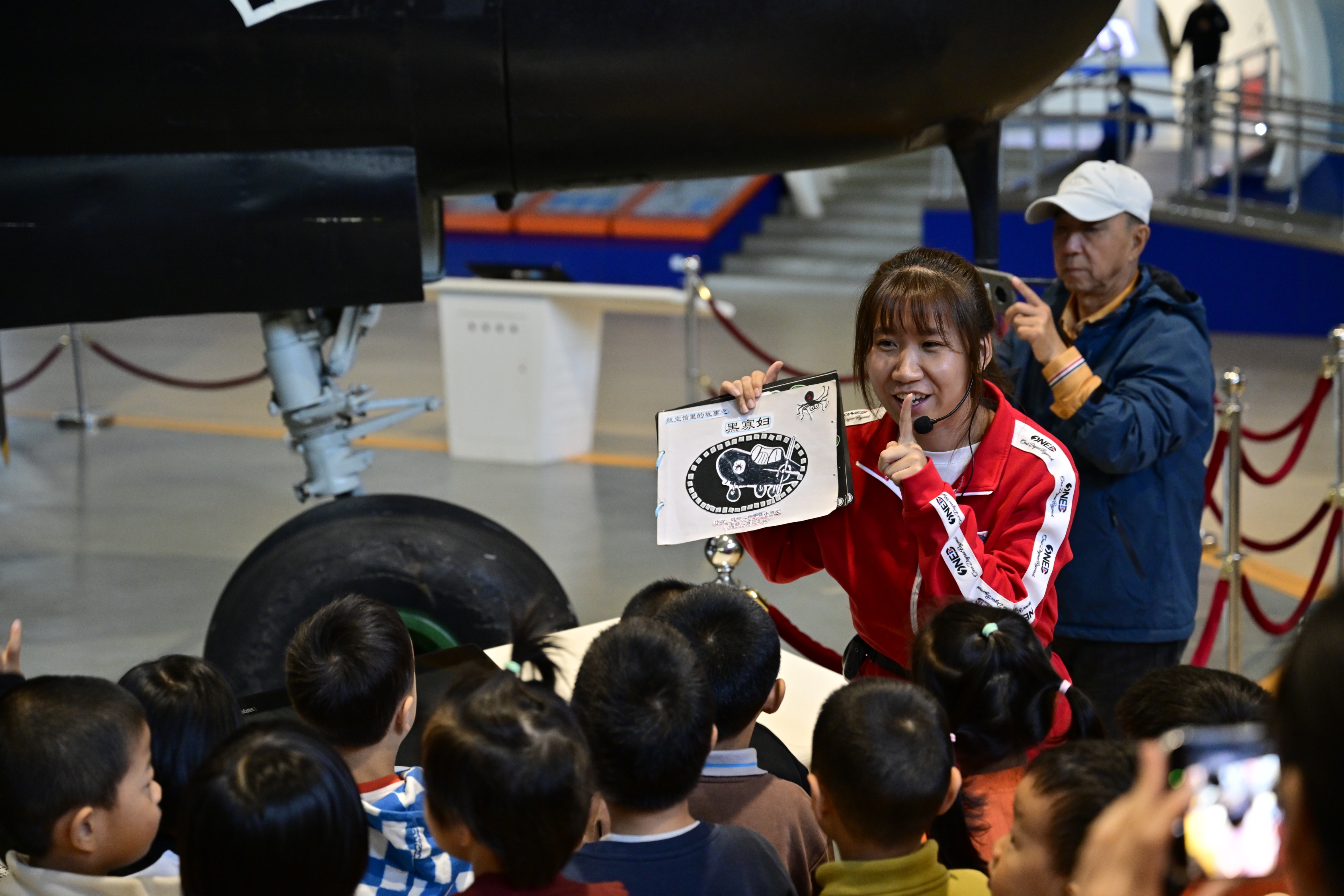 “在‘北京一号’下面有一架小飞机,它叫‘冯如三号’是为了纪念中国航空之父冯如先生。”“这个‘小飞碟’能像陀螺一样稳稳地悬在半空中, 一动不动地观察地面,就像咱们玩‘一二三木头人’时定住的样子。”开幕式后,联合志愿讲解团便开始了第一次活动。飞行学院的大哥哥们将深奥的空天科学知识转化为贴近孩子生活、易懂的语言和象形比喻,让科学原理变得更生动有趣,通俗易懂。
