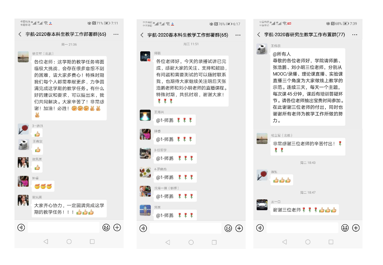 为了保障线上教学的顺利开展,宇航学院分别建立本科和研究生教学工作部署微信群,第一时间传达学校和学院指示,强调要高度重视线上授课的师德师风和意识形态工作,强化教学纪律,加强教学过程管控。同时,借助微信群积极解答任课教师关心的各种问题,交流研讨疫情防控期间教学方式方法,在交流互助中尽快提升网络教学资源建设和应用能力。学院组织全院任课教师参加学校的腾讯课堂集中培训,熟悉直播和录播的网络教学模式和腾讯课堂平台的使用方法;组织每门课程任课教师建立包括任课教师、选课学生、助教在内的课程远程教学群,及时联系选课学生,沟通课程教学安排和学生需求;在线调研学生居住地网络学习环境情况,为学生提供精准的学习帮助,同时为课程群制定授课方案提供参考。