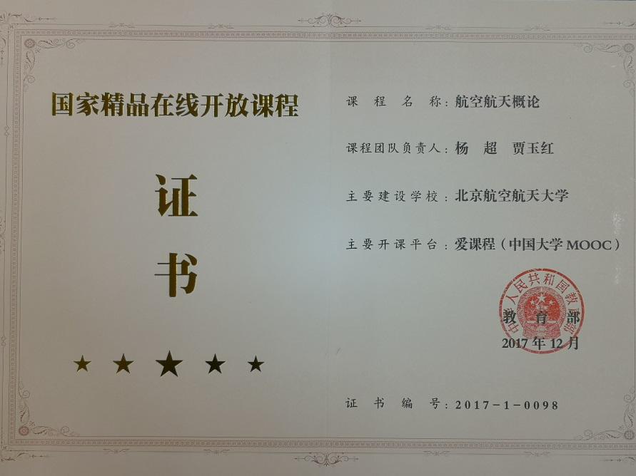 “航空航天概论”国家一流精品在线开放课程证书