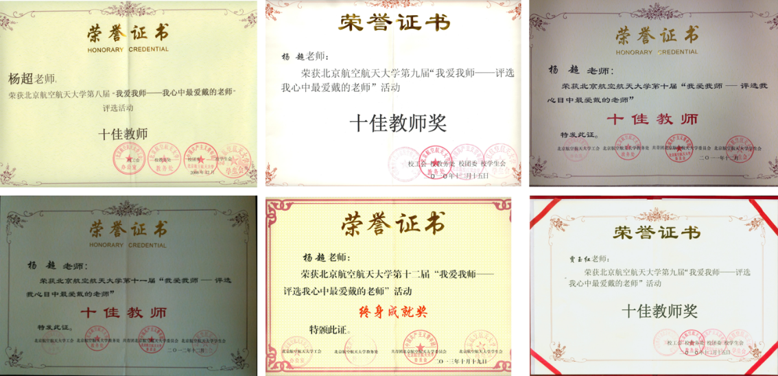 在北航学生组织的“我爱我师”评选活动中,杨超教授连续四届被本科生评为北航我爱我师“十佳教师”,并获得 “终身成就奖”。贾玉红教授2次获北航我爱我师“十佳教师”以及“最具亲和力”特色教师。戴玉婷副教授获得北航我爱我师“优秀青年教师奖”,罗明强副教授获北京市青年教师教学基本功比赛一等奖,教学质量得到了学生的认可。