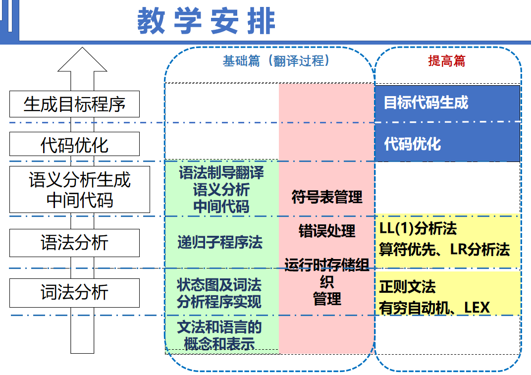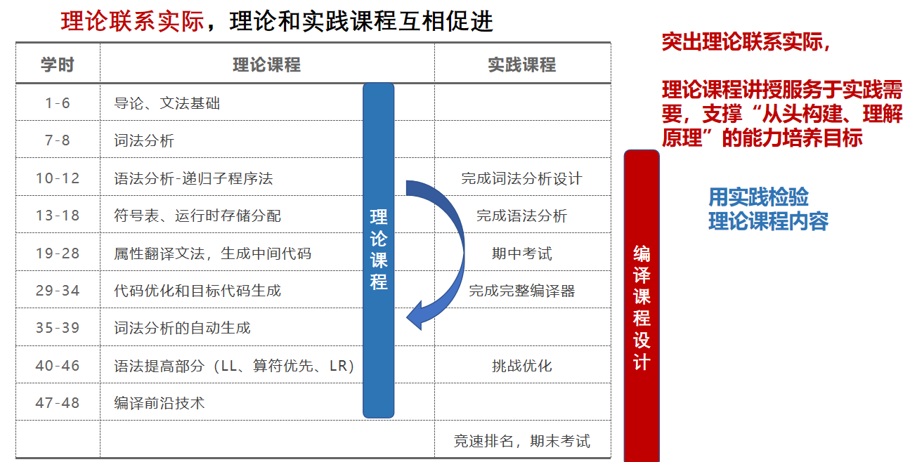 2.进阶式的课程组织方式,有利于学生首先理解完整的编译过程和编译系统,再进一步挑战编译自动化和优化。