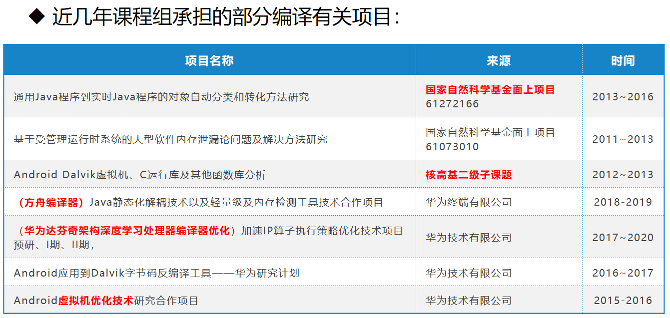 6.对编译科研方向的坚守是课程创新的基础和源泉。课程组承担了编译有关国家自然科学基金项目,参与了华为方舟编译器研究计划项目等。保证了教师的知识能力更新和科研成果到课堂的及时转化。