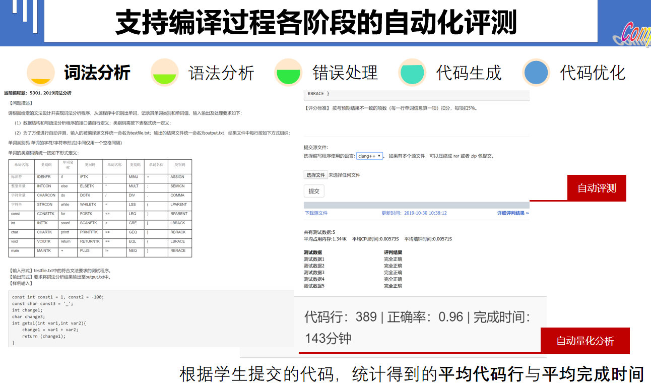 5.教学管理过程信息化、智能化。国内第一个课程中引入编译优化竞速排名,国内第一次实现编译构建全过程分阶段自动评判系统,从而为300多学生的教学过程提供了信息化和智能化管理平台,云端平台也支撑了学生随时随地开展课程实践。