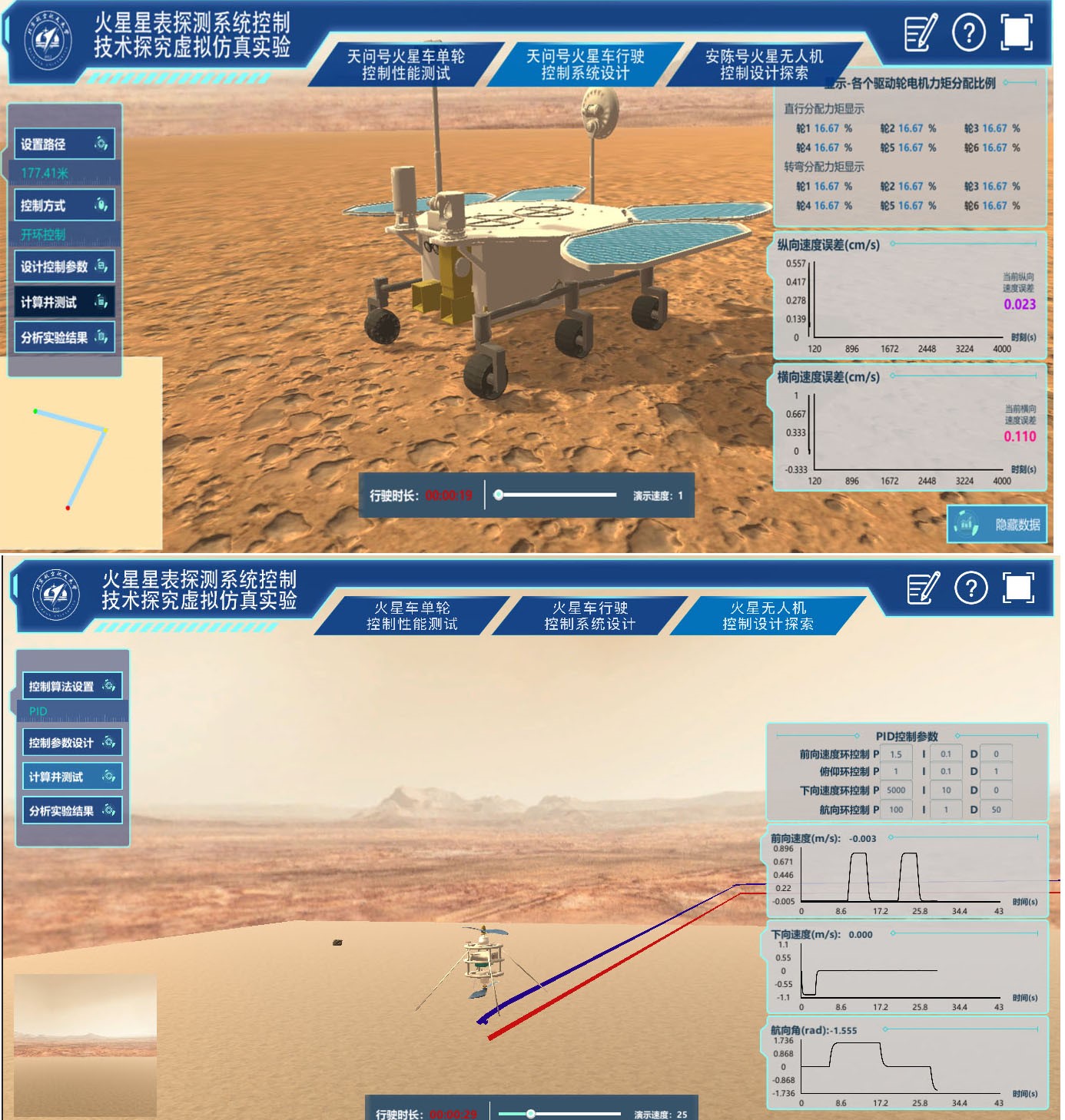 “火星星表探测系统控制技术探究”是面向新时代自动化专业高质量人才培养目标,以我国当前航空航天领域前瞻性的火星探测任务为背景的虚拟仿真实验。本项目来源于国家自然科学基金和某型月球车工程项目的科研成果,依托国家级虚拟仿真实验教学中心资源,采用虚拟现实、人机交互、信息处理等技术,构建了“虚拟实体协同、课内课外联动”的闭环教学方法及学习行为和实验效果的综合评价机制。支撑《自动控制原理》等课程的实验教学。