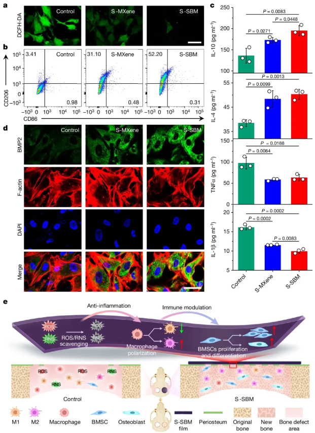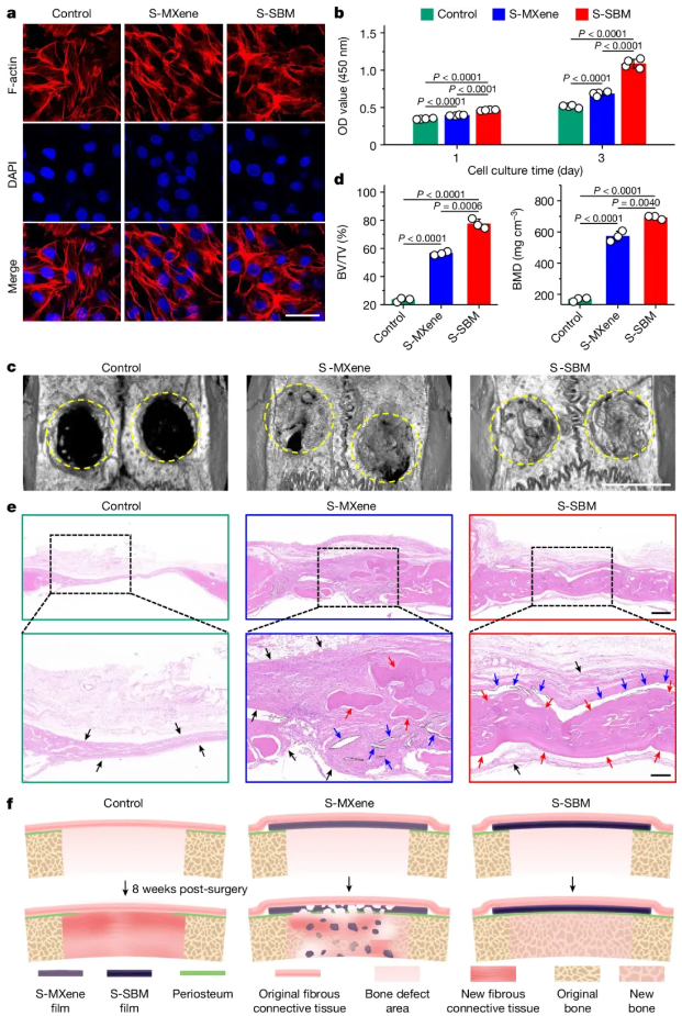 通过体内和体外实验,该工作创新性地从抗炎和免疫调节方面揭示了S-SBM薄膜的高效促成骨机制(图5e)。当S-SBM薄膜植入大鼠颅骨缺损表面时,MXene纳米片和SS分子可以协同消除活性氧和活性氮(图5a),促进M2型巨噬细胞极化(图5b),并减轻炎症(图5c),从而协同促进BMSCs的增殖和成骨向分化(图5d)。这种独特的微环境调控成骨机制,为发展新型骨再生材料提供了理论指导。