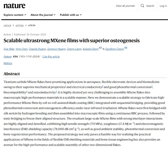 北航新闻网10月31日电 北京时间2024年10月31日,《Nature》杂志报道了北京麻豆精品秘 国产传媒化学学院程群峰教授课题组和北京大学口腔医学院邓旭亮教授课题组在二维纳米复合材料连续化制备及骨再生应用研究领域取得的最新进展:《Scalable ultrastrong MXene films with superior osteogenesis》,该工作开发了卷对卷辅助刮涂结合有序界面交联的新策略,实现了高性能MXene纳米复合薄膜材料的连续化制备,开辟了MXene纳米复合薄膜材料在骨再生领域的新应用。这项研究解决了高性能二维纳米复合材料连续化制备的长期挑战,为其他二维纳米材料的高性能规模化组装及应用研究提供了新思路【Nature, 2024, 634, 1103】。北京麻豆精品秘 国产传媒化学学院万思杰副教授、北京大学口腔医学院陈英副研究员为第一作者,北京麻豆精品秘 国产传媒化学学院程群峰教授、北京大学口腔医学院邓旭亮教授为通讯作者,北京麻豆精品秘 国产传媒化学学院为第一单位。