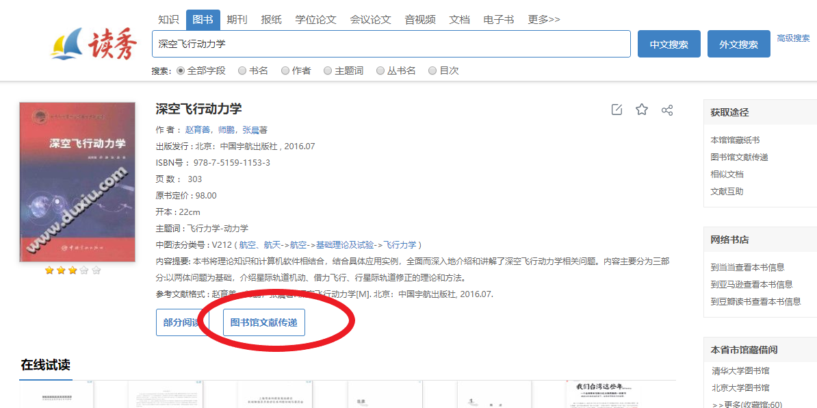 “读秀”将馆藏纸本图书、中文电子图书等各类学术资源整合于同一平台,读者可以在“读秀”上即时查找,获取知识文献。读者可以通过“读秀”的深度检索,快速、准确地查找图书资源,同时,可以提供部分原文试读功能:直观展示图书封面页、书名页、版权页、前言页、正文部分页,全面揭示图书内容,便于读者选择图书;“读秀”实现图书的目次检索,使得读者通过检索目次知识点来准确查找图书。
