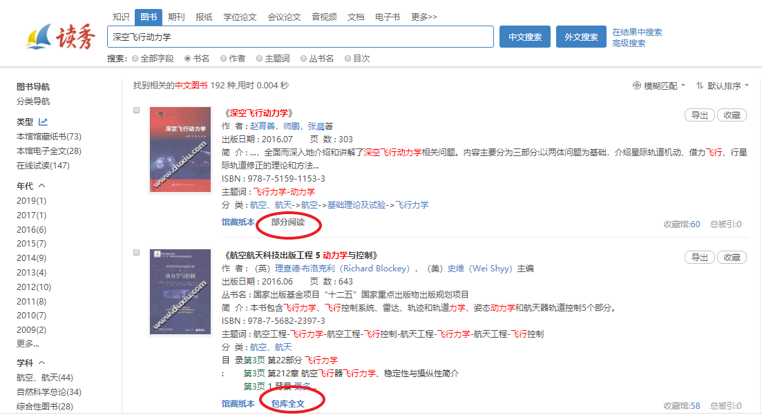 (2)根据需要选择相应的文献类型进行检索。对于本馆有电子版全文的资源,直接点击“包库全文”即可阅读;如果不能直接获取电子全文,可以通过“部分阅读”功能,试读文献的目录页、前言页、版权页和正文部分页。