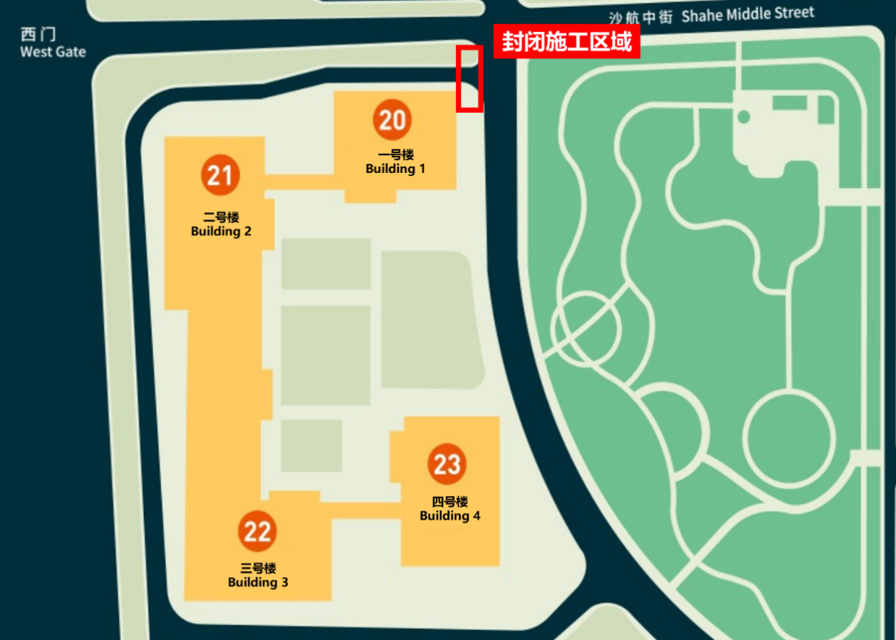 沙河校区图书馆项目电力外线施工,需要占用一号楼北侧环路出口,封闭区域如图所示。