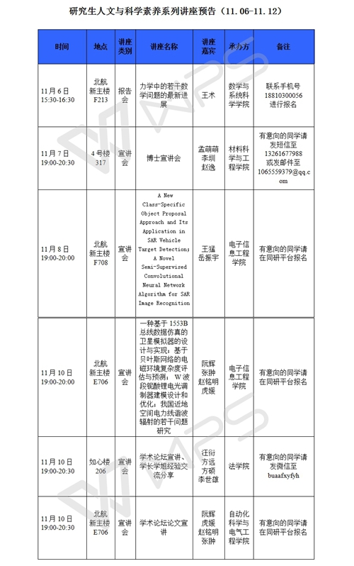 为提升我校研究生文化素养,培养研究生科学精神,促进研究生学术交流,营造具有传统与时代结合、人文与科学融合的研究生创新文化,党委研究生工作部于2016年3月启动我校研究生人文与科学素养提升平台建设。每周在校园网和研究生院官网上对近期即将举行的人文与科学素养讲座、报告或相关活动进行预告,欢迎感兴趣的同学积极参与。