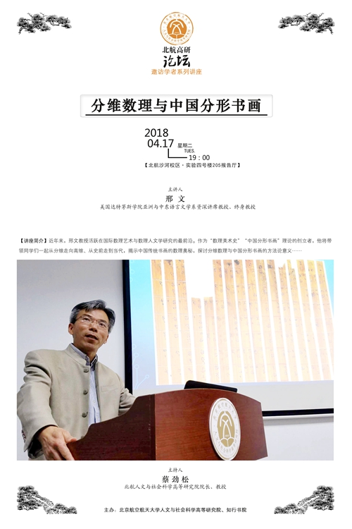近年来,邢文教授活跃在国际数理艺术与数理人文学研究的最前沿。作为“数理美术史”“中国分形书画”理论的创立者,他将带领同学们一起从分维走向高维、从史前走到当代,揭示中国传统书画的数理奥秘,探讨分维数理与中国分形书画的方法论意义……