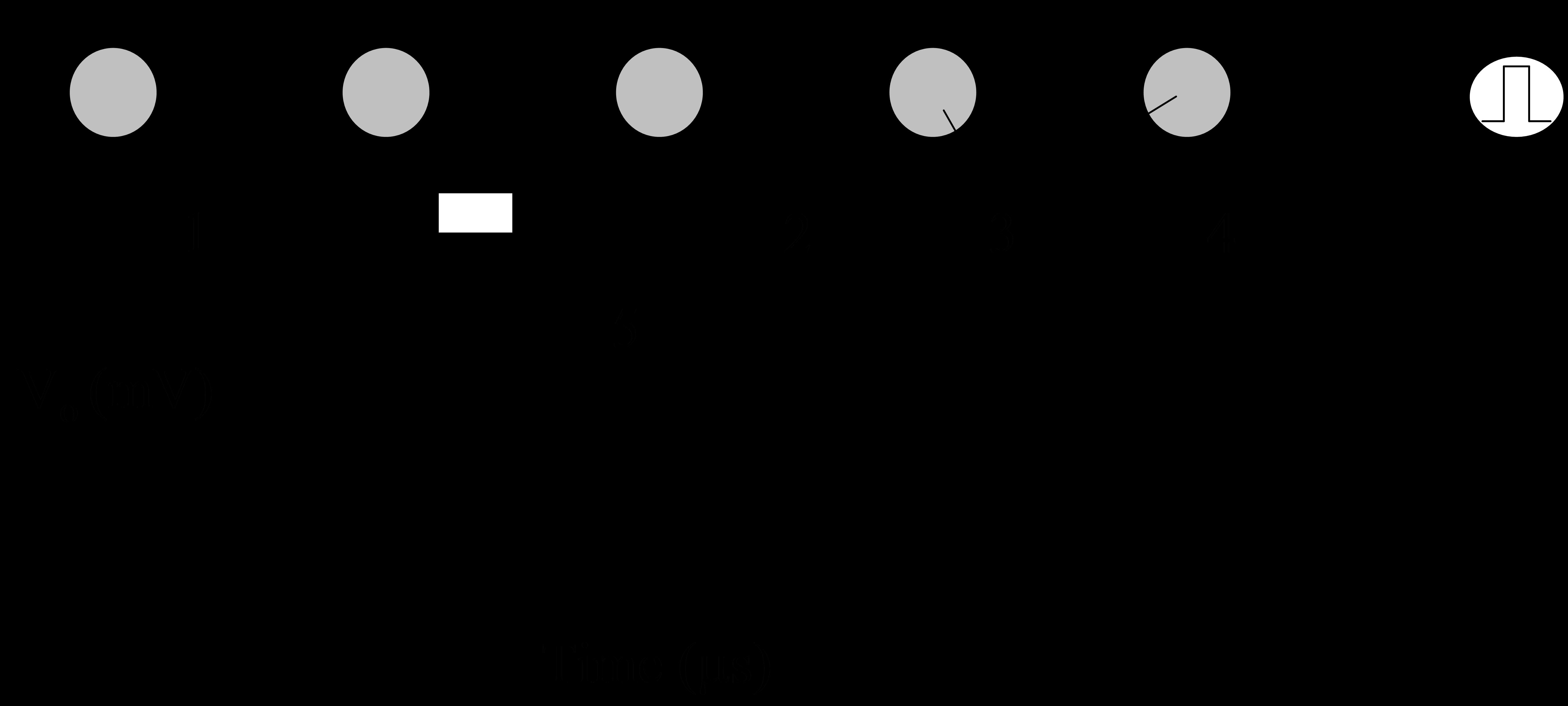 传感器示意图:(1) MDL, (2)脉冲电流导体, (3) 导电圆盘, (4) 探测线圈, (5) 移动的磁体。探测线圈响应的脉冲电压输出信号表明了两个导电圆盘之间永磁体的可能位置。
