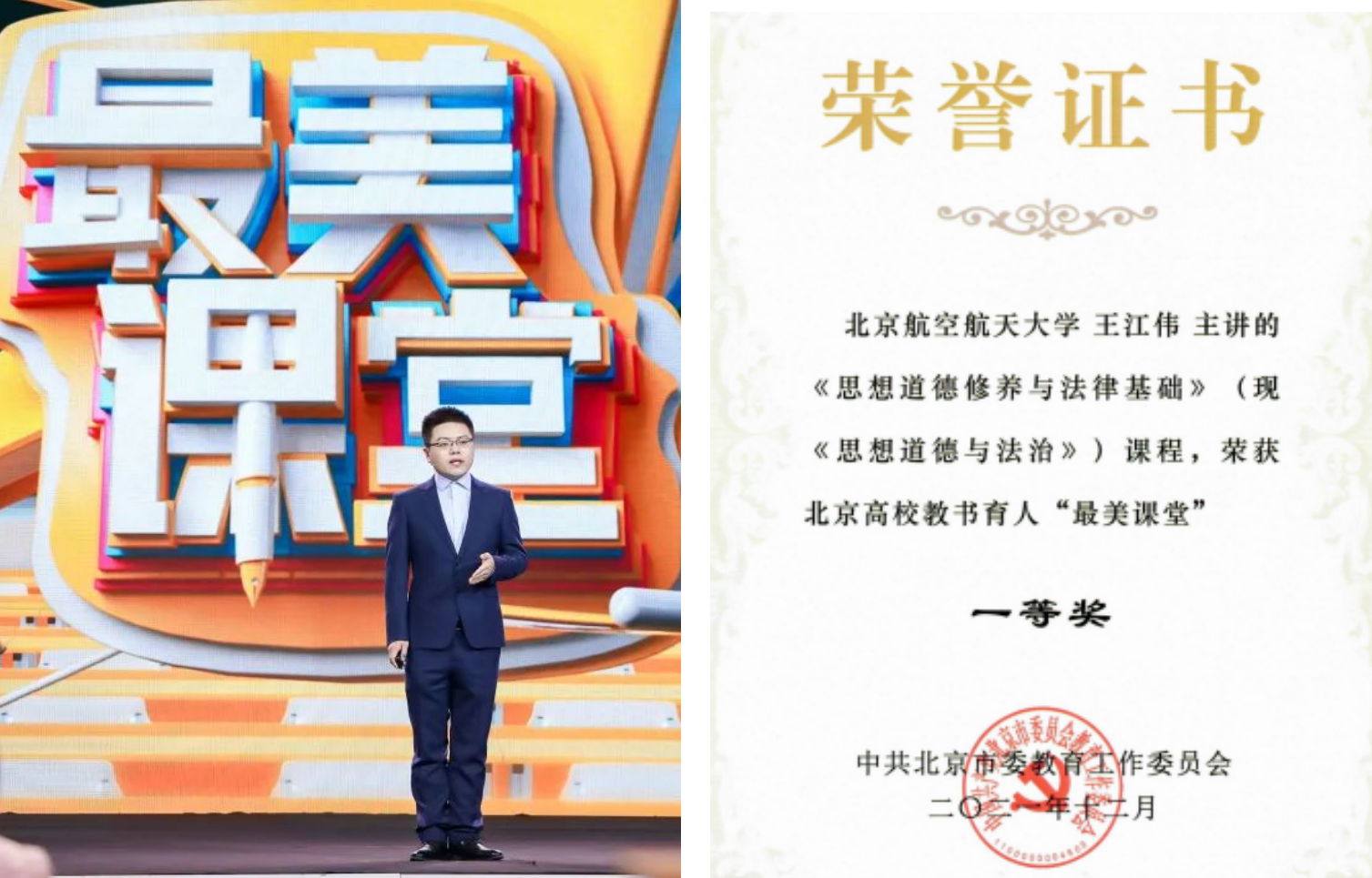 左:王江伟参加北京高校教书育人“最美课堂”评选决赛;右:王江伟获北京高校教书育人“最美课堂”一等奖