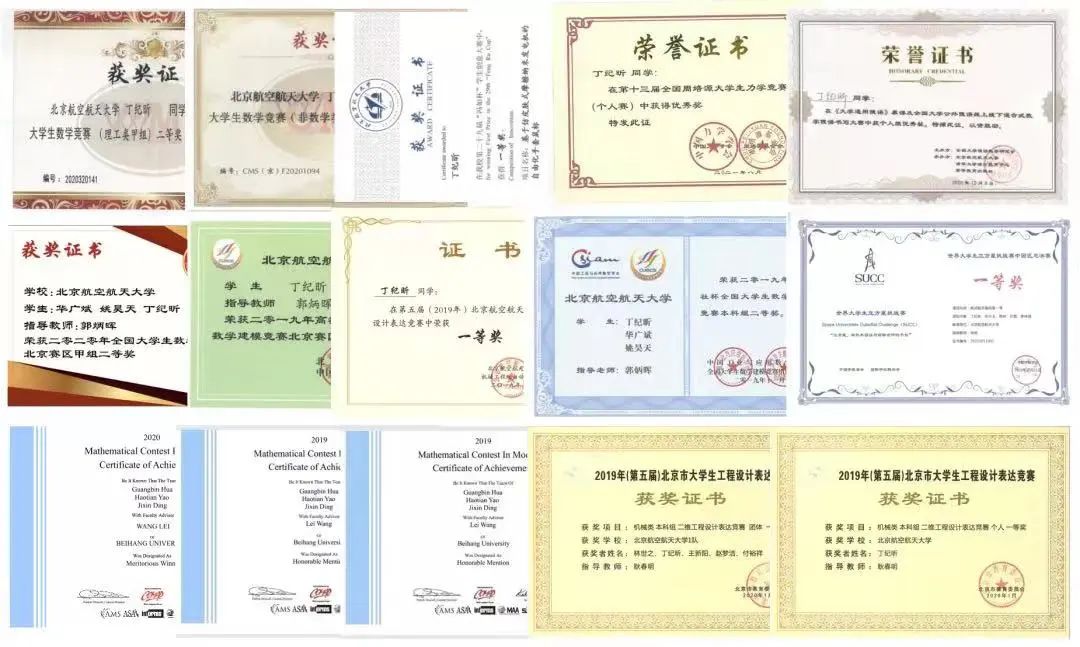 “好风凭借力”,追逐航天梦的道路上,我并非踽踽独行。我与队友在数学建模中砥砺奋进,六度挑战,大二连续获得校级、国家级、国际级数学建模大赛的3项一等奖;初试科创,获得冯如杯创意大赛一等奖;与队友设计用于部队野外战斗的无人机发射器并申请专利,得到航天二院、中航工业专家认可。在竞赛科创中我取得15个奖项,8项是一等奖。我也注重学以致用,在2门满分力学结课后受邀参与教材编写,将课程学习经验通过书本传承。